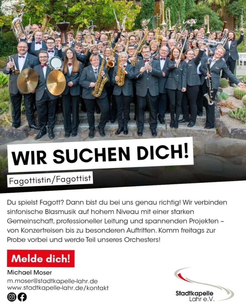 Unter der Leitung von Nicholas Reed spielt die Stadtkapelle Lahr am 11. Mai ab 15:00 Uhr ein buntes Unterhaltungsprogramm. Das Konzert dauert ca. 75 – 90 Minuten.