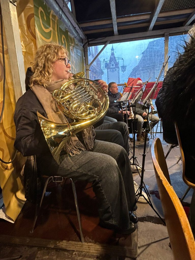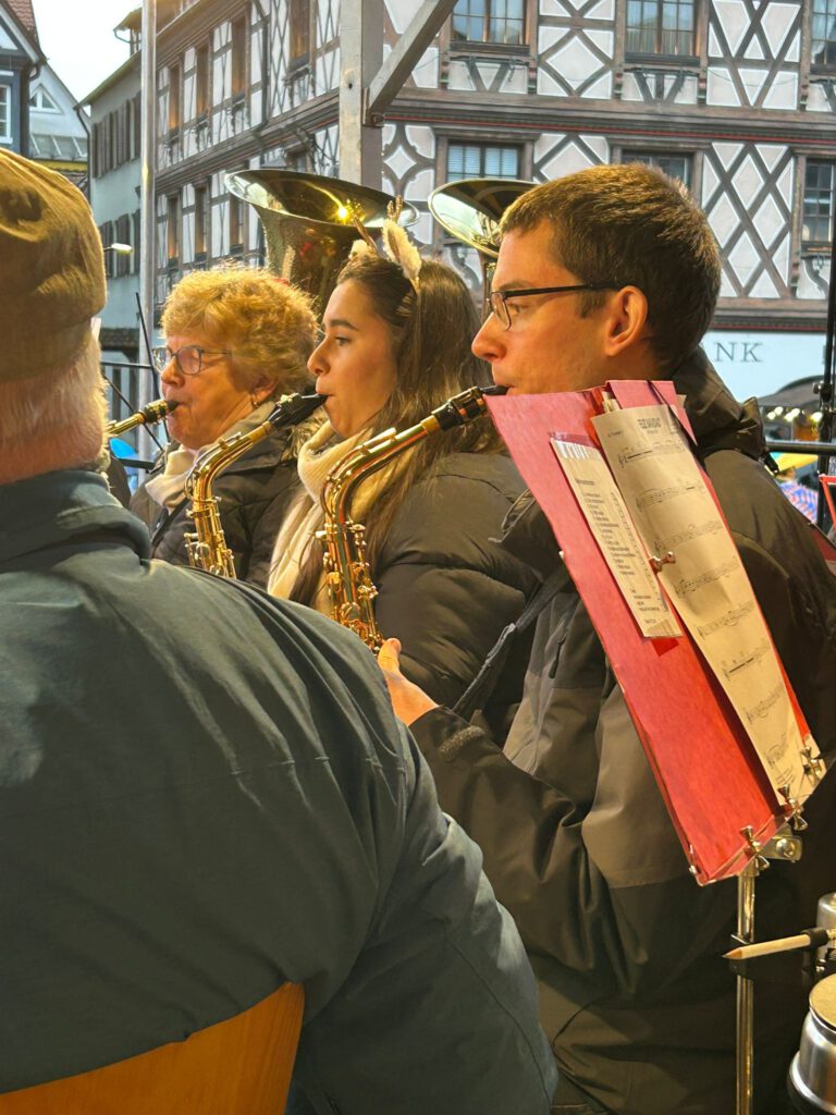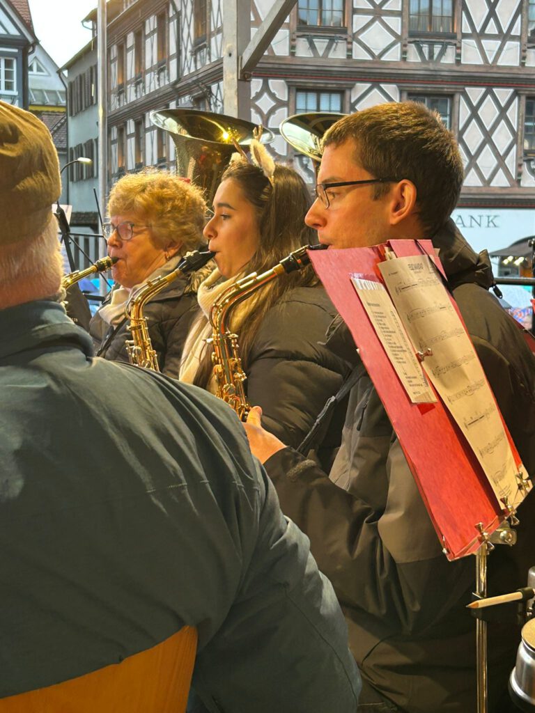 Trotz des Wetters versammelten sich zahlreiche Besucherinnen und Besucher auf dem Marktplatz, um den weihnachtlichen Klängen zu lauschen. Mit einer Auswahl an festlichen Melodien und traditionellen Stücken begeisterten die Musikerinnen und Musiker das Publikum und trugen zu einem besonderen Adventsmoment bei.